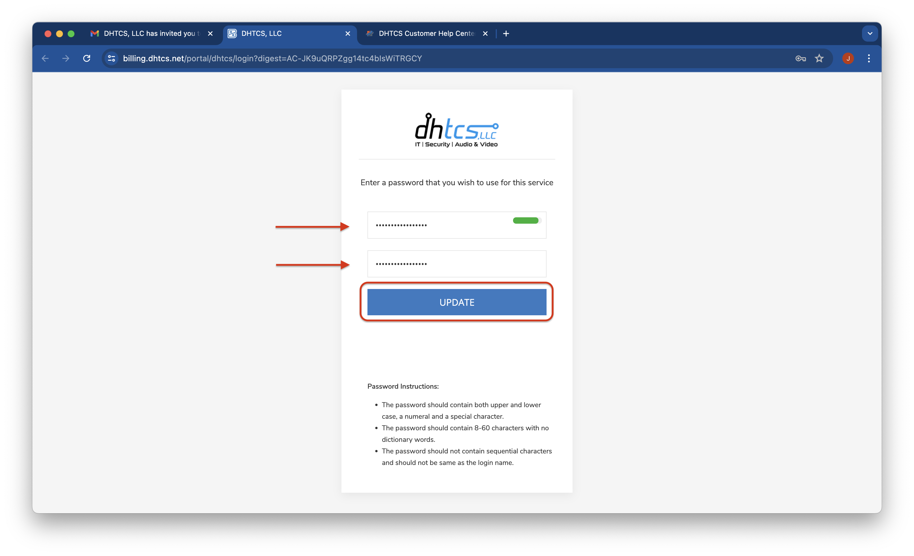 3. Enter a password unlike that of any other DHTCS, LLC portal account that you may have. Click UPDATE.