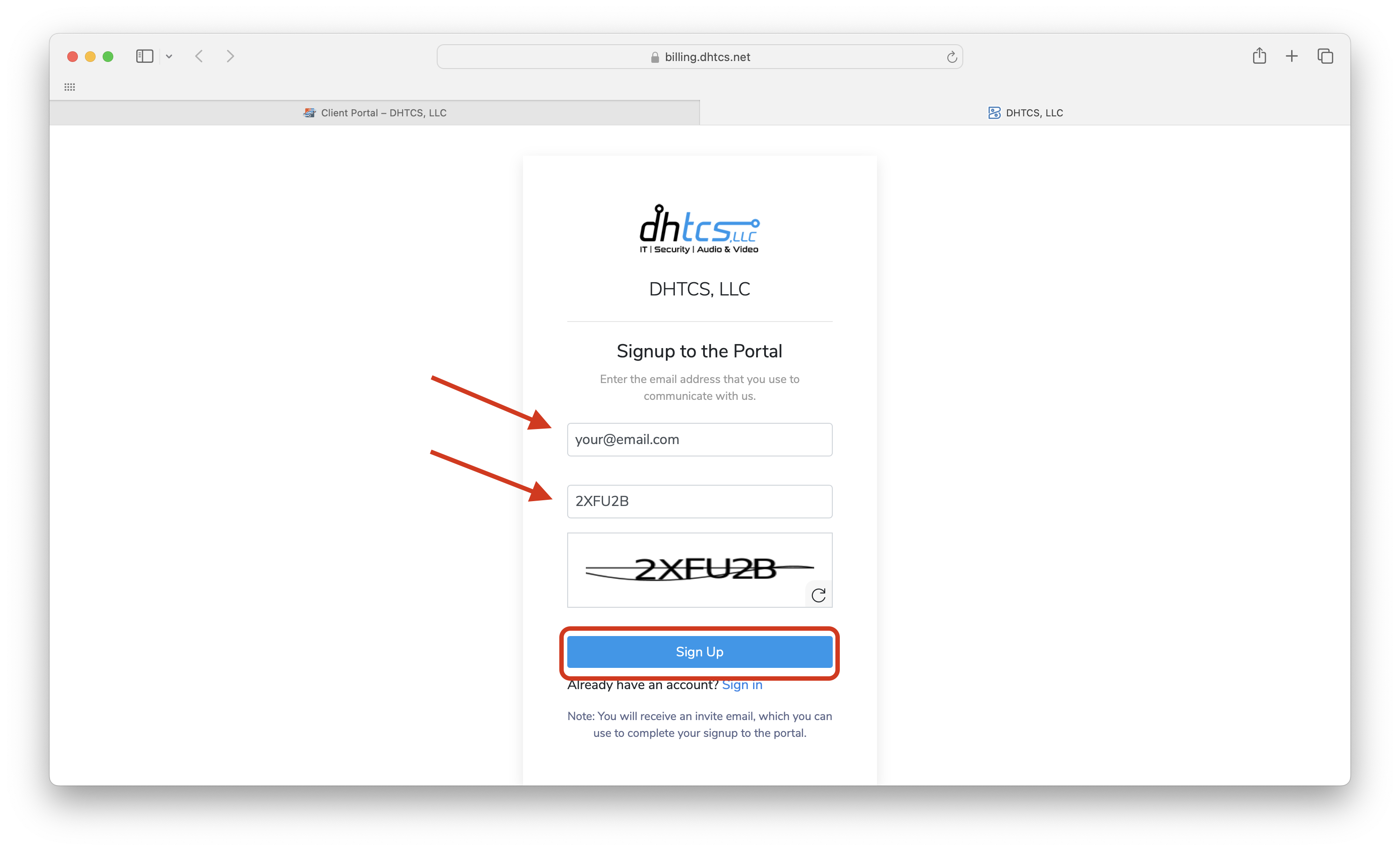 2. Enter your email address, and place the CAPCHA in the appropriate box. Then click Sign Up. An email will be sent to the address you signed up with asking you to verify your account.