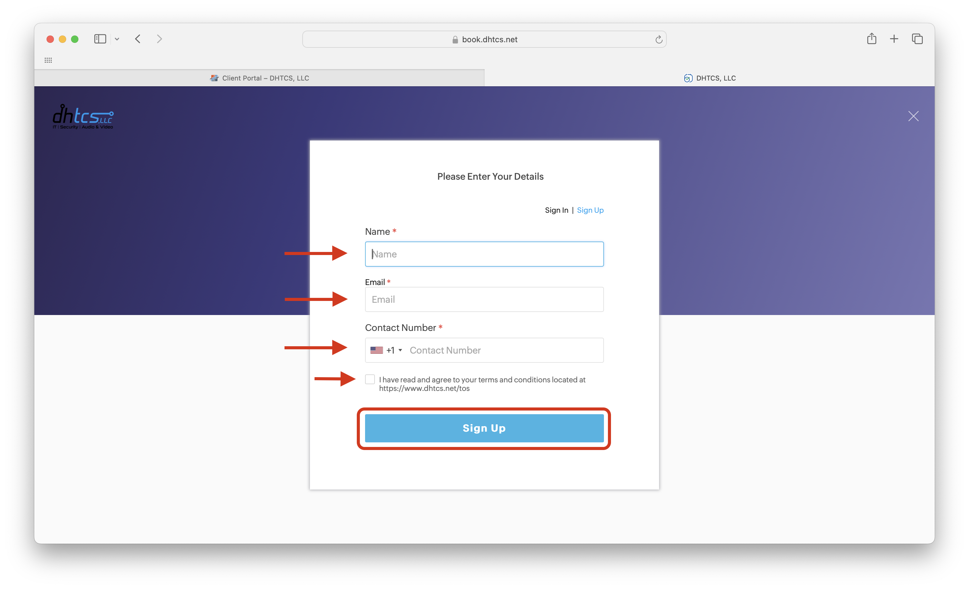 2. Enter your first and last name, email address, and best contact number to reach you. Then, check the box and accept the terms. When ready, click "Sign Up". An email will be sent to you requesting that you confirm your account. Click on the link in the email to confirm.