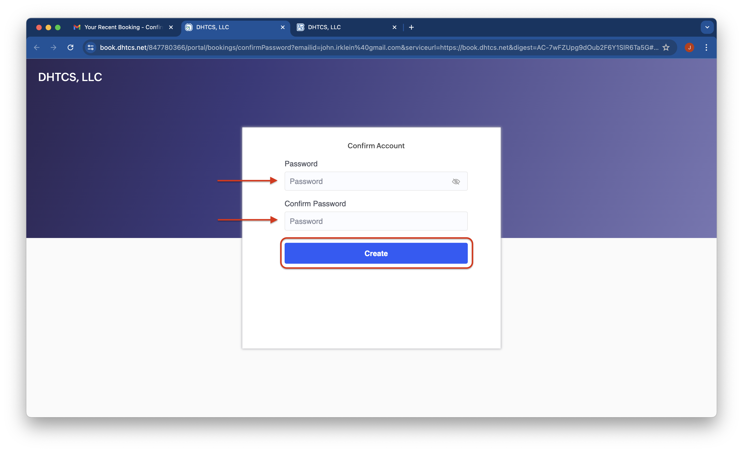 3. Then create a password for your new account. Enter your password again and click "Create".